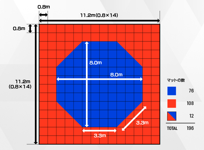 試合は競技コートの上で行います。競技コートは競技エリアと安全エリアで構成されています。競技エリアと安全エリアを含む競技コートは、11.2 m ✕ 11.2 m の範囲で正方形に設置します。競技エリアは、向かい合う面 (対極線) との直径が 8 m であり、八角形の各辺の長さは約 3.3 m です。競技エリアの境界線から競技コートの限界線 (外側) の間は安全エリアです。競技エリアと安全エリアのマットは異なる色で設置する必要があり、その色の決定は大会競技規程に従います。競技コートの縁の線を境界線とし、選手の両足が境界線を超え越えるとカムチョン (減点) が宣告されます。