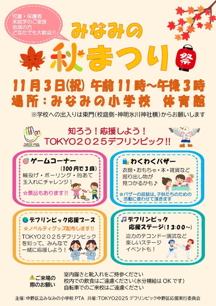 中野区立みなみの小学校PTAは11月3日(祝)午前11時から午後3時まで、「みなみの秋まつり」を開催しました。東京2025デフリンピック応援中野区実行委員会ではPTAとの共催で「デフリンピック応援ブース」と「デフリンピック応援ステージ」を行うことになりました。応援ブースでは、デフリンピックの紹介やグッズの配布を行いました。また、応援ステージでは、デフリンピックやテコンドー、中野区の姉妹区ソウル特別市陽川区、デフリンピックの新しい応援スタイルであるサインエールなどを紹介する当実行委員会制作動画の上映や、一流のコーチを招いての迫力あふれるテコンドーのパフォーマンスなどが行われました。